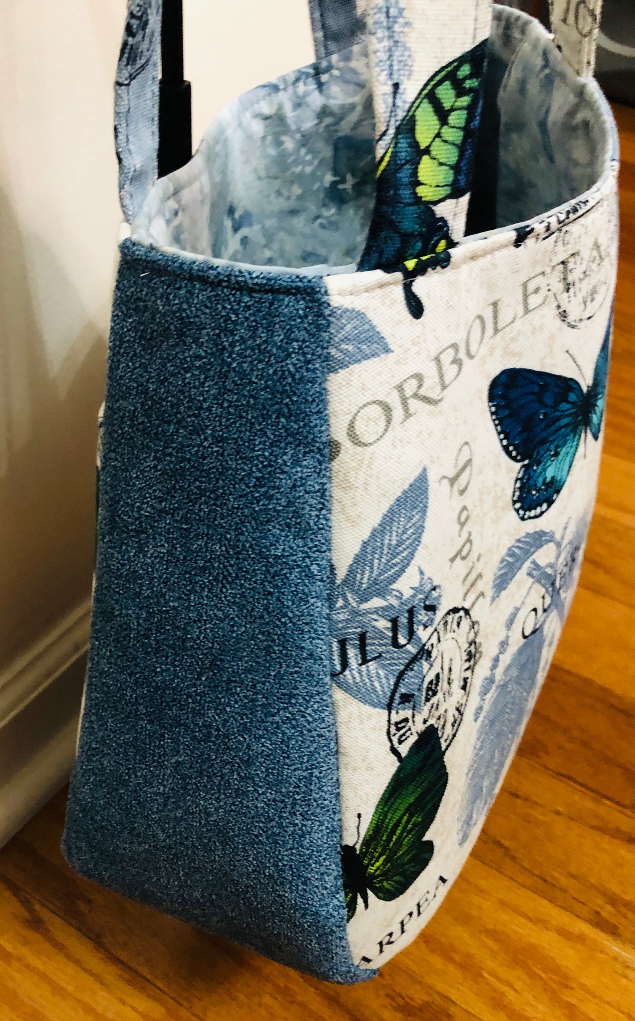 This tote is made with canvas exterior and cotton interior. It has a double slip pocket on the exterior and a large slip pocket interior.