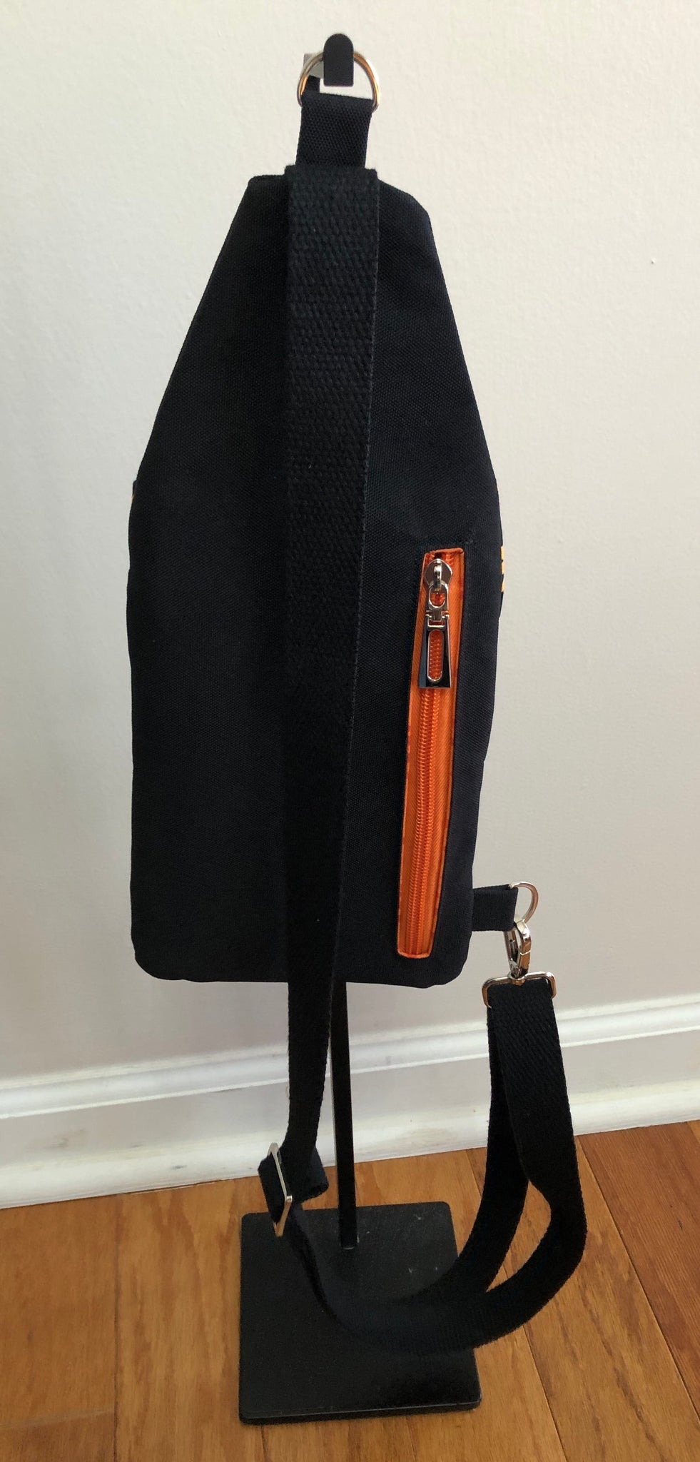 Easy access zipper pocket at the front, and a secure, hidden zipper pocket on the back that will take a small wallet. Inside lining is cotton.
