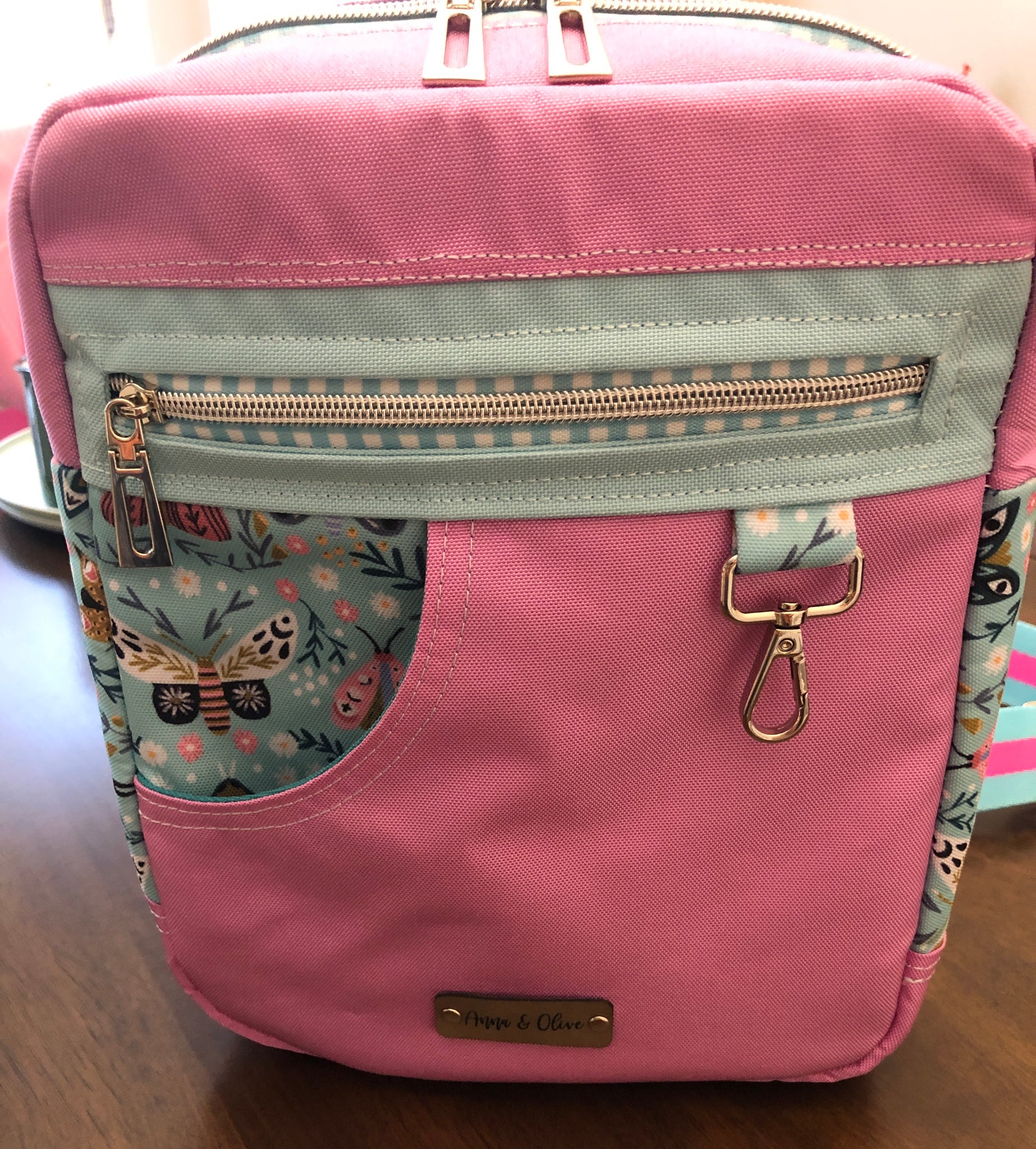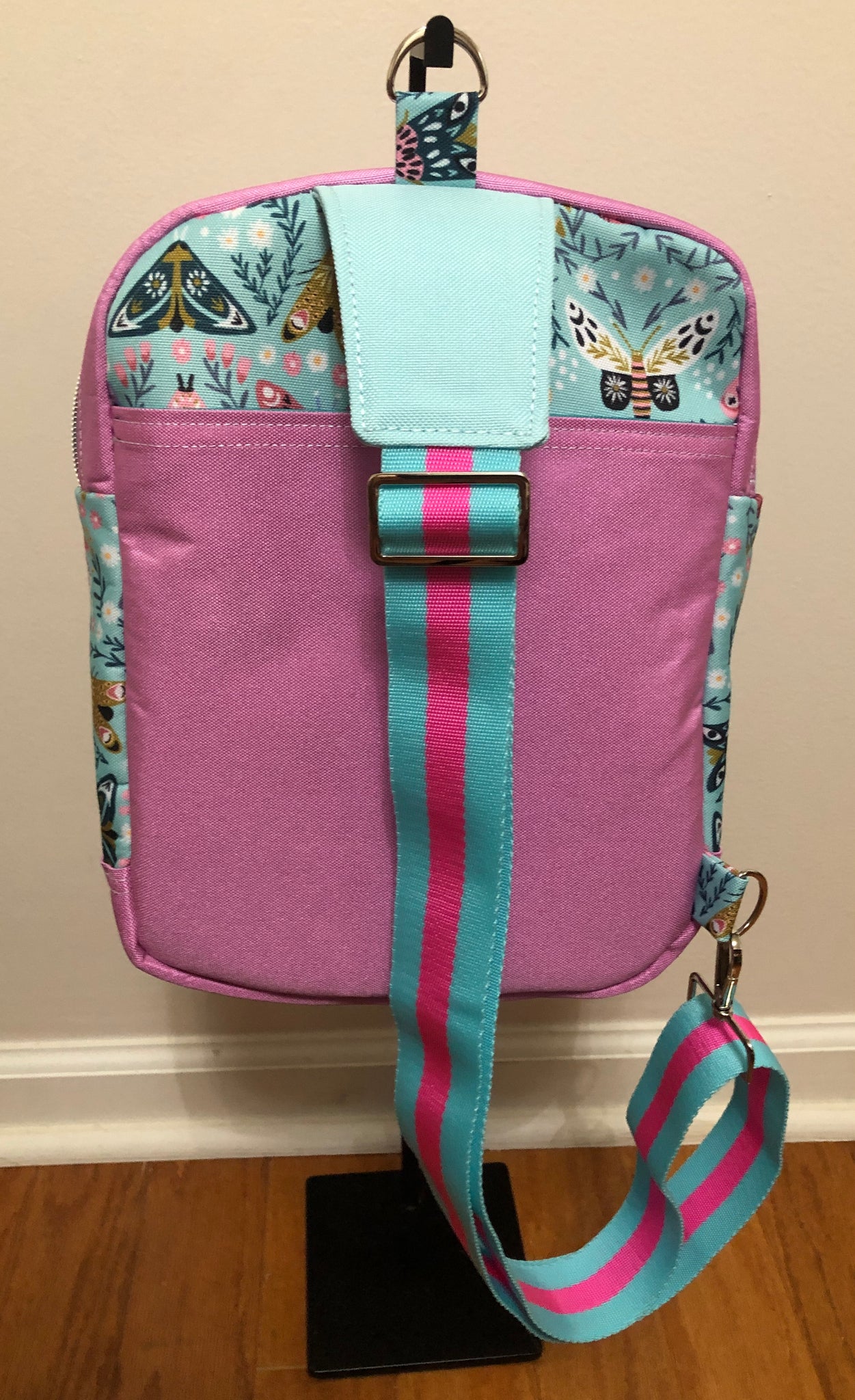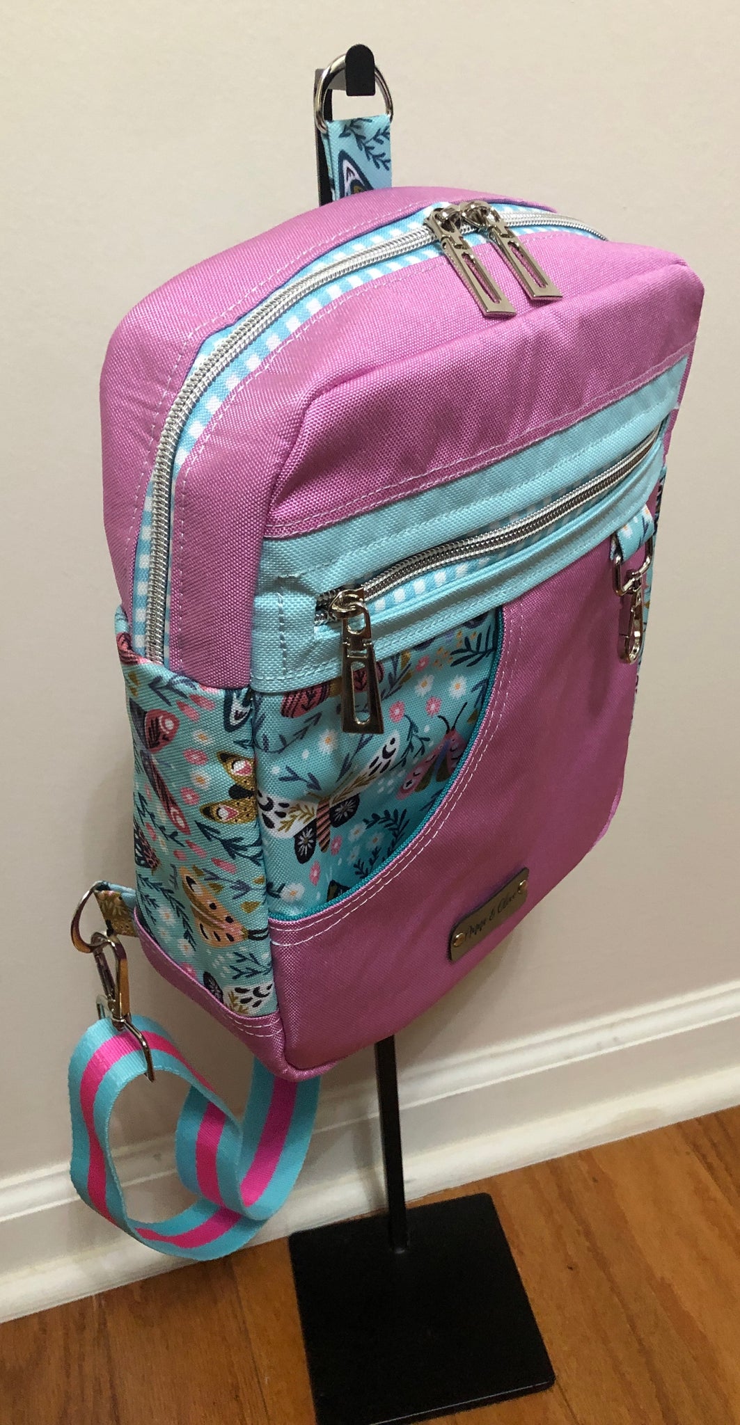 Front zipper pocket, slip pocket, hook for keys etc.. Hook on top for hanging.