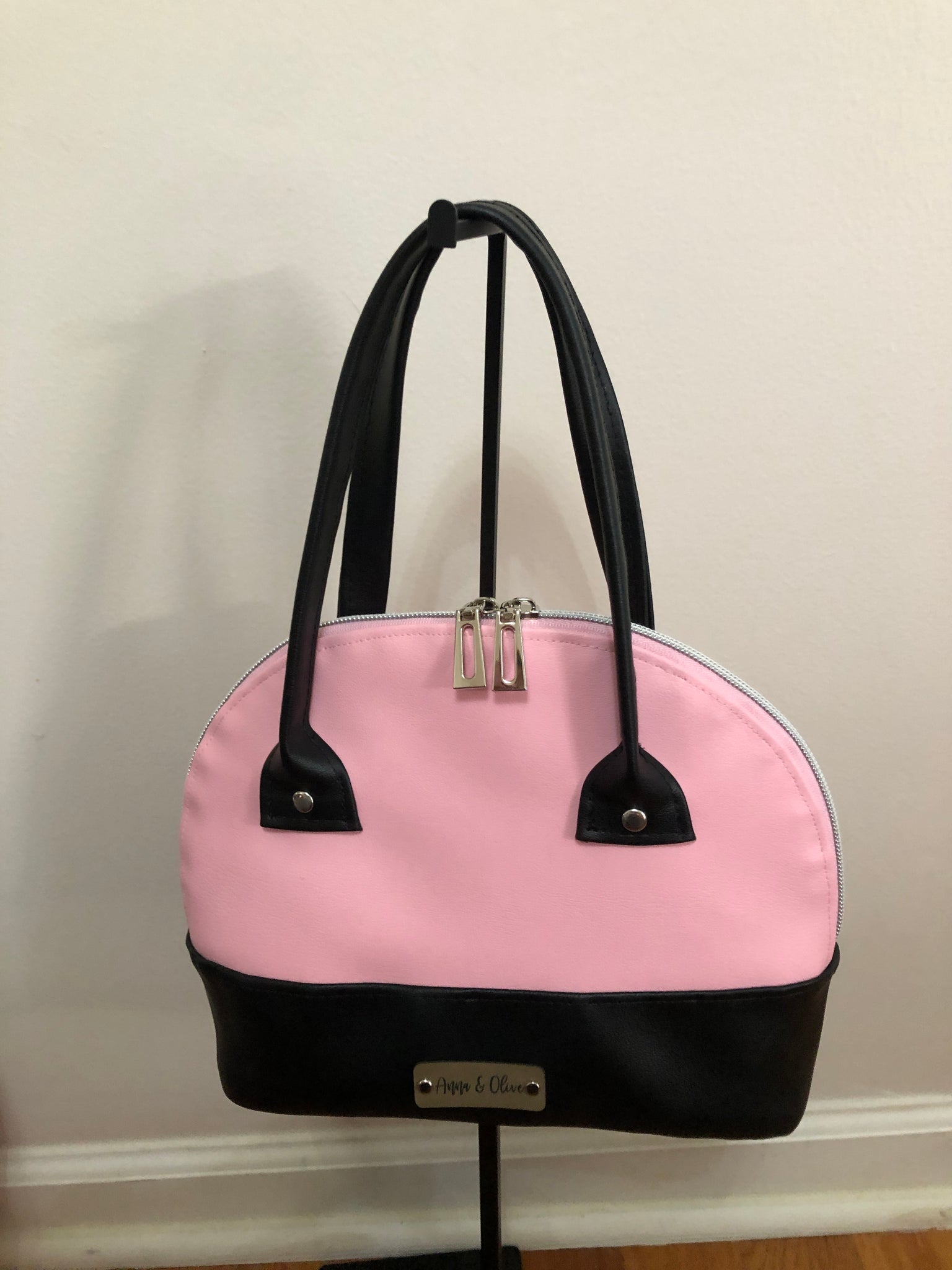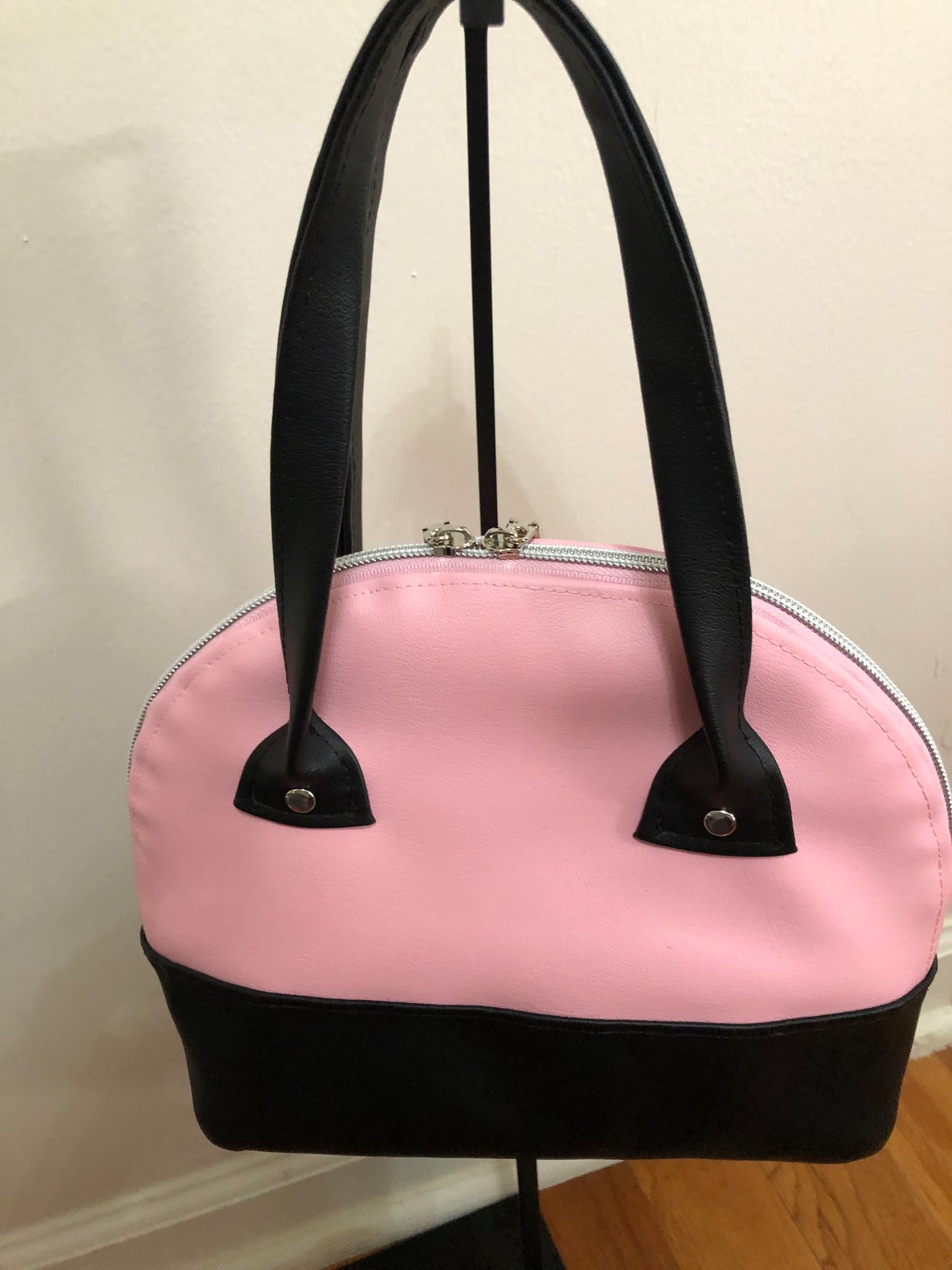 This hand bag has a double zipper closure, small inside zipper pocket.